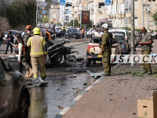 Ramat Gan, Israel, April 04, 2026 Iranian Cluster Munition Strike Across Central IsraelDay 36 of the war between Israel, the United States, and Iran. An Iranian cluster munition missile launched at central Israel caused damage to buildings and vehicles in several locations across the Gush Dan region, including Ramat Gan, Petah Tikva, Bnei Brak, Rosh HaAyin, and Givatayim. Magen David Adom reported one 50-year-old man sustained minor injuries from the blast wave, April 04, 2026, Israel.Photo by Shaul Greenfeld JStock