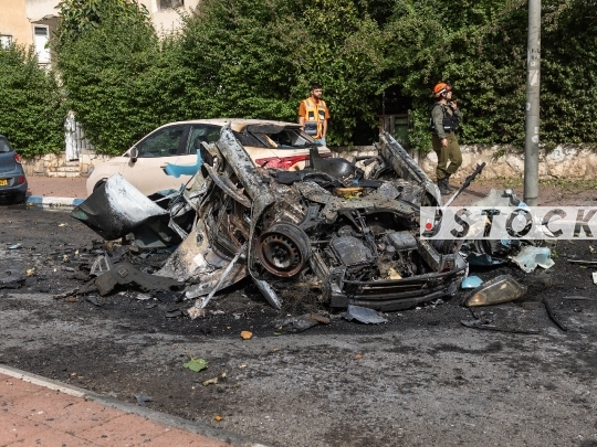 Ramat Gan, Israel, April 04, 2026 Iranian Cluster Munition Strike Across Central IsraelDay 36 of the war between Israel, the United States, and Iran. An Iranian cluster munition missile launched at central Israel caused damage to buildings and vehicles in several locations across the Gush Dan region, including Ramat Gan, Petah Tikva, Bnei Brak, Rosh HaAyin, and Givatayim. Magen David Adom reported one 50-year-old man sustained minor injuries from the blast wave, April 04, 2026, Israel.Photo by Shaul Greenfeld JStock