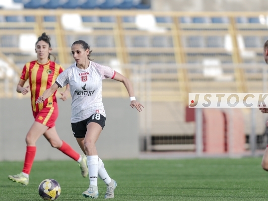 FBL-ISR Women's Premier League, Matchday 21: Maccabi Panterot Ashdod (in red-and-yellow striped shirts) vs. Hapoel Katamon Jerusalem (in white shirts and black shorts), Haberfeld Stadium, Rishon LeZion, Israel, March 26, 2026. The league resumes following an extended hiatus due to the international break and the ongoing conflict involving Israel, the United States, and Iran. Photo by Shaul Greenfeld/JStock.