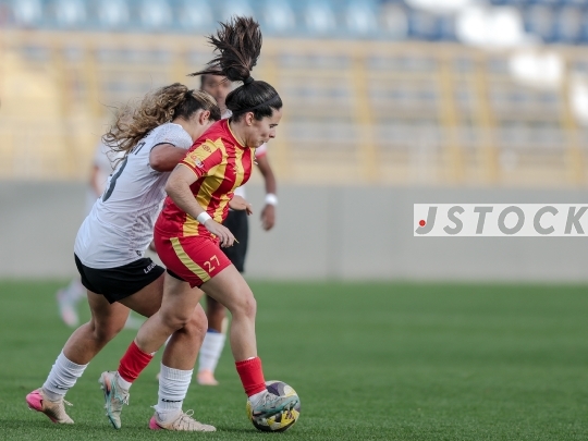 FBL-ISR Women's Premier League, Matchday 21: Maccabi Panterot Ashdod (in red-and-yellow striped shirts) vs. Hapoel Katamon Jerusalem (in white shirts and black shorts), Haberfeld Stadium, Rishon LeZion, Israel, March 26, 2026. The league resumes following an extended hiatus due to the international break and the ongoing conflict involving Israel, the United States, and Iran. Photo by Shaul Greenfeld/JStock.