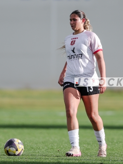 FBL-ISR Women's Premier League, Matchday 21: Maccabi Panterot Ashdod (in red-and-yellow striped shirts) vs. Hapoel Katamon Jerusalem (in white shirts and black shorts), Haberfeld Stadium, Rishon LeZion, Israel, March 26, 2026. The league resumes following an extended hiatus due to the international break and the ongoing conflict involving Israel, the United States, and Iran. Photo by Shaul Greenfeld/JStock.