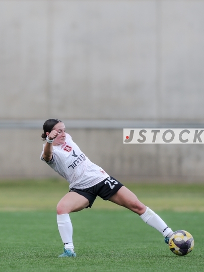 FBL-ISR Women's Premier League, Matchday 21: Maccabi Panterot Ashdod (in red-and-yellow striped shirts) vs. Hapoel Katamon Jerusalem (in white shirts and black shorts), Haberfeld Stadium, Rishon LeZion, Israel, March 26, 2026. The league resumes following an extended hiatus due to the international break and the ongoing conflict involving Israel, the United States, and Iran. Photo by Shaul Greenfeld/JStock.