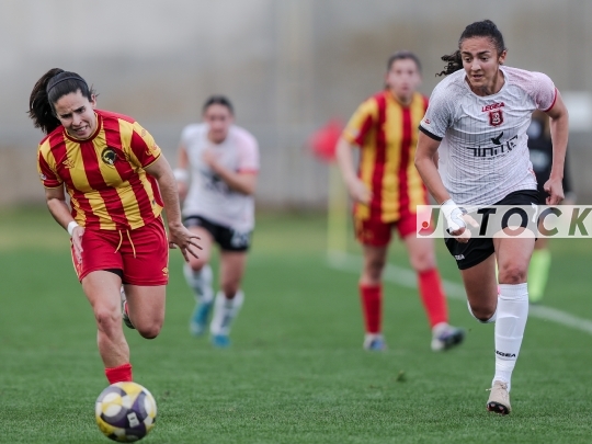 FBL-ISR Women's Premier League, Matchday 21: Maccabi Panterot Ashdod (in red-and-yellow striped shirts) vs. Hapoel Katamon Jerusalem (in white shirts and black shorts), Haberfeld Stadium, Rishon LeZion, Israel, March 26, 2026. The league resumes following an extended hiatus due to the international break and the ongoing conflict involving Israel, the United States, and Iran. Photo by Shaul Greenfeld/JStock.