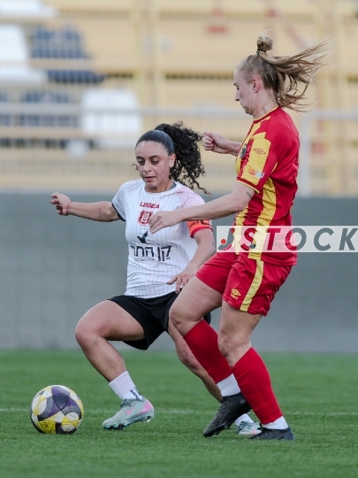 FBL-ISR Women's Premier League, Matchday 21: Maccabi Panterot Ashdod (in red-and-yellow striped shirts) vs. Hapoel Katamon Jerusalem (in white shirts and black shorts), Haberfeld Stadium, Rishon LeZion, Israel, March 26, 2026. The league resumes following an extended hiatus due to the international break and the ongoing conflict involving Israel, the United States, and Iran. Photo by Shaul Greenfeld/JStock.