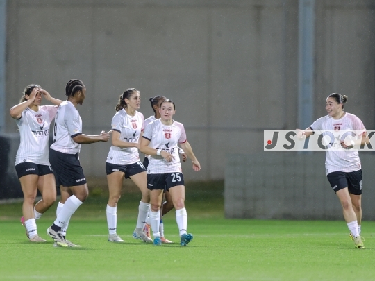 FBL-ISR Women's Premier League, Matchday 21: Maccabi Panterot Ashdod (in red-and-yellow striped shirts) vs. Hapoel Katamon Jerusalem (in white shirts and black shorts), Haberfeld Stadium, Rishon LeZion, Israel, March 26, 2026. The league resumes following an extended hiatus due to the international break and the ongoing conflict involving Israel, the United States, and Iran. Photo by Shaul Greenfeld/JStock.