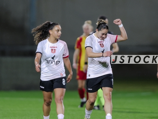 FBL-ISR Women's Premier League, Matchday 21: Maccabi Panterot Ashdod (in red-and-yellow striped shirts) vs. Hapoel Katamon Jerusalem (in white shirts and black shorts), Haberfeld Stadium, Rishon LeZion, Israel, March 26, 2026. The league resumes following an extended hiatus due to the international break and the ongoing conflict involving Israel, the United States, and Iran. Photo by Shaul Greenfeld/JStock.