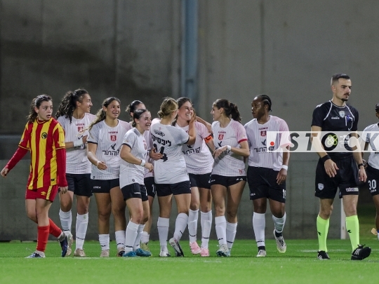 FBL-ISR Women's Premier League, Matchday 21: Maccabi Panterot Ashdod (in red-and-yellow striped shirts) vs. Hapoel Katamon Jerusalem (in white shirts and black shorts), Haberfeld Stadium, Rishon LeZion, Israel, March 26, 2026. The league resumes following an extended hiatus due to the international break and the ongoing conflict involving Israel, the United States, and Iran. Photo by Shaul Greenfeld/JStock.