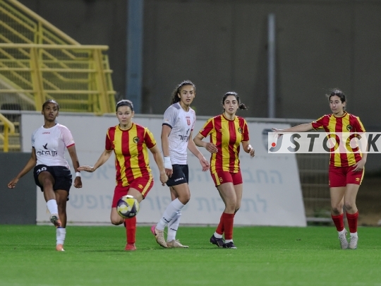 FBL-ISR Women's Premier League, Matchday 21: Maccabi Panterot Ashdod (in red-and-yellow striped shirts) vs. Hapoel Katamon Jerusalem (in white shirts and black shorts), Haberfeld Stadium, Rishon LeZion, Israel, March 26, 2026. The league resumes following an extended hiatus due to the international break and the ongoing conflict involving Israel, the United States, and Iran. Photo by Shaul Greenfeld/JStock.