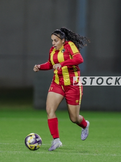 FBL-ISR Women's Premier League, Matchday 21: Maccabi Panterot Ashdod (in red-and-yellow striped shirts) vs. Hapoel Katamon Jerusalem (in white shirts and black shorts), Haberfeld Stadium, Rishon LeZion, Israel, March 26, 2026. The league resumes following an extended hiatus due to the international break and the ongoing conflict involving Israel, the United States, and Iran. Photo by Shaul Greenfeld/JStock.