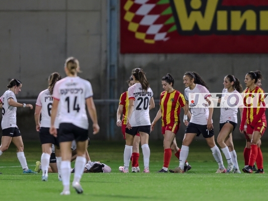 FBL-ISR Women's Premier League, Matchday 21: Maccabi Panterot Ashdod (in red-and-yellow striped shirts) vs. Hapoel Katamon Jerusalem (in white shirts and black shorts), Haberfeld Stadium, Rishon LeZion, Israel, March 26, 2026. The league resumes following an extended hiatus due to the international break and the ongoing conflict involving Israel, the United States, and Iran. Photo by Shaul Greenfeld/JStock.