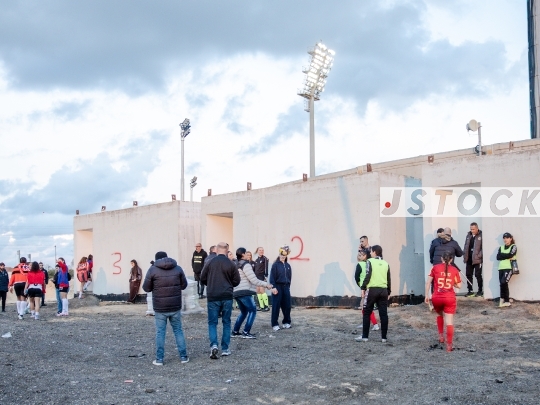 FBL-ISR Women’s Premier League, Matchday 21—Panterot Ashdod vs. Hapoel Katamon Jerusalem, March 26, 2026, Rishon LeZion, Israel. War routine: Day 27 of the war involving the United States, Israel, and Iran. The Women’s Premier League returned from both the international break and the forced wartime hiatus on a day marked by 10 rocket sirens. During the match, two rocket alerts were triggered, forcing the players to evacuate to a protected area off the pitch. Between sirens, the Panterot Ashdod coach conducted a tactical briefing with the players inside the shelter. Photo by Shaul Greenfeld/JStock.