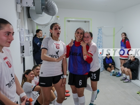 FBL-ISR Women’s Premier League, Matchday 21—Panterot Ashdod vs. Hapoel Katamon Jerusalem, March 26, 2026, Rishon LeZion, Israel. War routine: Day 27 of the war involving the United States, Israel, and Iran. The Women’s Premier League returned from both the international break and the forced wartime hiatus on a day marked by 10 rocket sirens. During the match, two rocket alerts were triggered, forcing the players to evacuate to a protected area off the pitch. Between sirens, the Panterot Ashdod coach conducted a tactical briefing with the players inside the shelter. Photo by Shaul Greenfeld/JStock.
