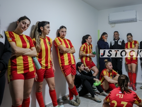 FBL-ISR Women’s Premier League, Matchday 21—Panterot Ashdod vs. Hapoel Katamon Jerusalem, March 26, 2026, Rishon LeZion, Israel. War routine: Day 27 of the war involving the United States, Israel, and Iran. The Women’s Premier League returned from both the international break and the forced wartime hiatus on a day marked by 10 rocket sirens. During the match, two rocket alerts were triggered, forcing the players to evacuate to a protected area off the pitch. Between sirens, the Panterot Ashdod coach conducted a tactical briefing with the players inside the shelter. Photo by Shaul Greenfeld/JStock.