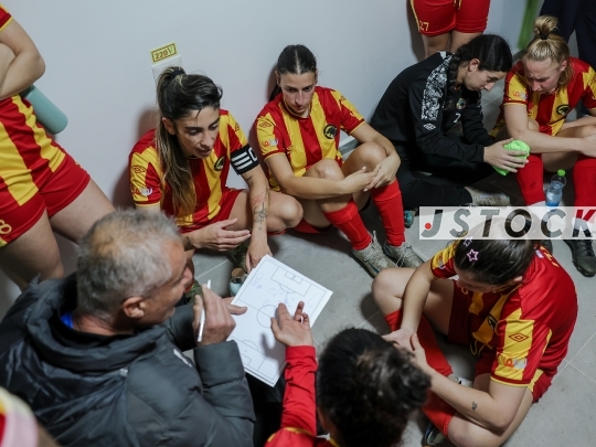 FBL-ISR Women’s Premier League, Matchday 21—Panterot Ashdod vs. Hapoel Katamon Jerusalem, March 26, 2026, Rishon LeZion, Israel. War routine: Day 27 of the war involving the United States, Israel, and Iran. The Women’s Premier League returned from both the international break and the forced wartime hiatus on a day marked by 10 rocket sirens. During the match, two rocket alerts were triggered, forcing the players to evacuate to a protected area off the pitch. Between sirens, the Panterot Ashdod coach conducted a tactical briefing with the players inside the shelter. Photo by Shaul Greenfeld/JStock.
