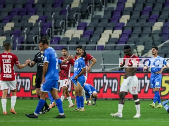 FBL-ISR Israeli State Cup Semi-Final – Hapoel Beer Sheva (in red) vs. Bnei Yehuda Tel Aviv (in blue), April 09, 2026, Bloomfield Stadium, Tel Aviv, Israel. The match takes place one day after the ceasefire announcement between Iran and Israel. Due to lingering security restrictions, the game is being played behind closed doors without spectators.