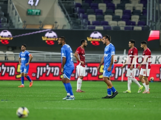FBL-ISR Israeli State Cup Semi-Final – Hapoel Beer Sheva (in red) vs. Bnei Yehuda Tel Aviv (in blue), April 09, 2026, Bloomfield Stadium, Tel Aviv, Israel. The match takes place one day after the ceasefire announcement between Iran and Israel. Due to lingering security restrictions, the game is being played behind closed doors without spectators.