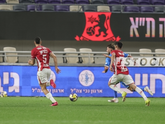 FBL-ISR Israeli State Cup Semi-Final – Hapoel Beer Sheva (in red) vs. Bnei Yehuda Tel Aviv (in blue), April 09, 2026, Bloomfield Stadium, Tel Aviv, Israel. The match takes place one day after the ceasefire announcement between Iran and Israel. Due to lingering security restrictions, the game is being played behind closed doors without spectators.