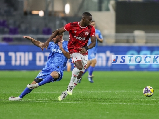 FBL-ISR Israeli State Cup Semi-Final – Hapoel Beer Sheva (in red) vs. Bnei Yehuda Tel Aviv (in blue), April 09, 2026, Bloomfield Stadium, Tel Aviv, Israel. The match takes place one day after the ceasefire announcement between Iran and Israel. Due to lingering security restrictions, the game is being played behind closed doors without spectators.