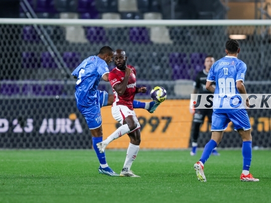 FBL-ISR Israeli State Cup Semi-Final – Hapoel Beer Sheva (in red) vs. Bnei Yehuda Tel Aviv (in blue), April 09, 2026, Bloomfield Stadium, Tel Aviv, Israel. The match takes place one day after the ceasefire announcement between Iran and Israel. Due to lingering security restrictions, the game is being played behind closed doors without spectators.