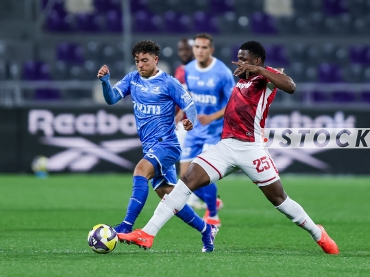 FBL-ISR Israeli State Cup Semi-Final – Hapoel Beer Sheva (in red) vs. Bnei Yehuda Tel Aviv (in blue), April 09, 2026, Bloomfield Stadium, Tel Aviv, Israel. The match takes place one day after the ceasefire announcement between Iran and Israel. Due to lingering security restrictions, the game is being played behind closed doors without spectators.