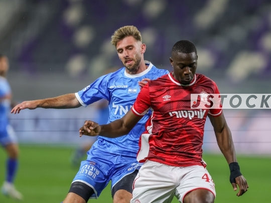 FBL-ISR Israeli State Cup Semi-Final – Hapoel Beer Sheva (in red) vs. Bnei Yehuda Tel Aviv (in blue), April 09, 2026, Bloomfield Stadium, Tel Aviv, Israel. The match takes place one day after the ceasefire announcement between Iran and Israel. Due to lingering security restrictions, the game is being played behind closed doors without spectators.