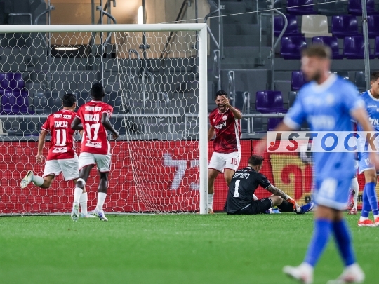 FBL-ISR Israeli State Cup Semi-Final – Hapoel Beer Sheva (in red) vs. Bnei Yehuda Tel Aviv (in blue), April 09, 2026, Bloomfield Stadium, Tel Aviv, Israel. The match takes place one day after the ceasefire announcement between Iran and Israel. Due to lingering security restrictions, the game is being played behind closed doors without spectators.
