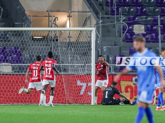 FBL-ISR Israeli State Cup Semi-Final – Hapoel Beer Sheva (in red) vs. Bnei Yehuda Tel Aviv (in blue), April 09, 2026, Bloomfield Stadium, Tel Aviv, Israel. The match takes place one day after the ceasefire announcement between Iran and Israel. Due to lingering security restrictions, the game is being played behind closed doors without spectators.