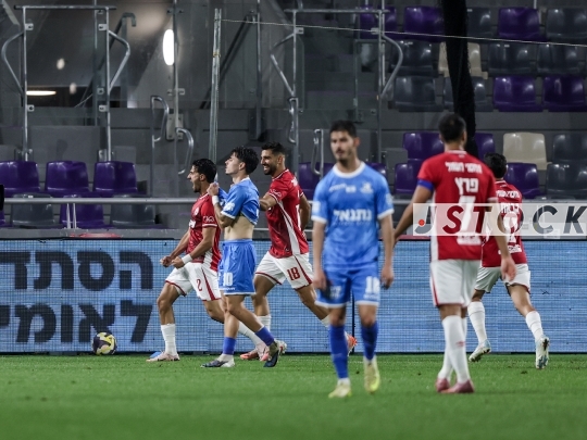 FBL-ISR Israeli State Cup Semi-Final – Hapoel Beer Sheva (in red) vs. Bnei Yehuda Tel Aviv (in blue), April 09, 2026, Bloomfield Stadium, Tel Aviv, Israel. The match takes place one day after the ceasefire announcement between Iran and Israel. Due to lingering security restrictions, the game is being played behind closed doors without spectators.
