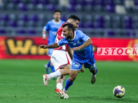 FBL-ISR Israeli State Cup Semi-Final – Hapoel Beer Sheva (in red) vs. Bnei Yehuda Tel Aviv (in blue), April 09, 2026, Bloomfield Stadium, Tel Aviv, Israel. The match takes place one day after the ceasefire announcement between Iran and Israel. Due to lingering security restrictions, the game is being played behind closed doors without spectators.