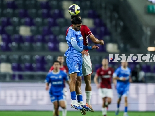 FBL-ISR Israeli State Cup Semi-Final – Hapoel Beer Sheva (in red) vs. Bnei Yehuda Tel Aviv (in blue), April 09, 2026, Bloomfield Stadium, Tel Aviv, Israel. The match takes place one day after the ceasefire announcement between Iran and Israel. Due to lingering security restrictions, the game is being played behind closed doors without spectators.