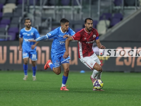 FBL-ISR Israeli State Cup Semi-Final – Hapoel Beer Sheva (in red) vs. Bnei Yehuda Tel Aviv (in blue), April 09, 2026, Bloomfield Stadium, Tel Aviv, Israel. The match takes place one day after the ceasefire announcement between Iran and Israel. Due to lingering security restrictions, the game is being played behind closed doors without spectators.