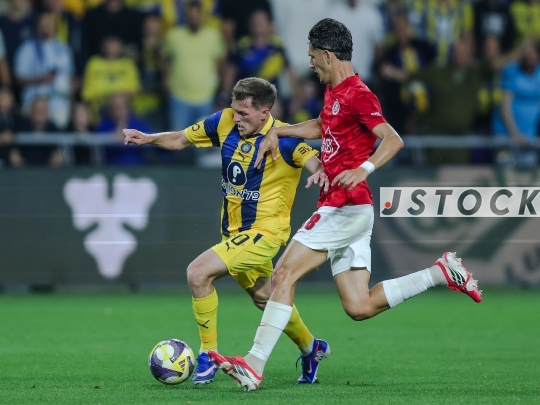 FBL-ISR Israeli Premier League Matchday 27 – Maccabi Tel Aviv (in Yelow) vs. Hapoel Tel Aviv (in red), April 19, 2026, Bloomfield Stadium, Tel Aviv, Israel. The Tel Aviv Derby, marking the opening round of the Championship Playoff (Upper Playoff).